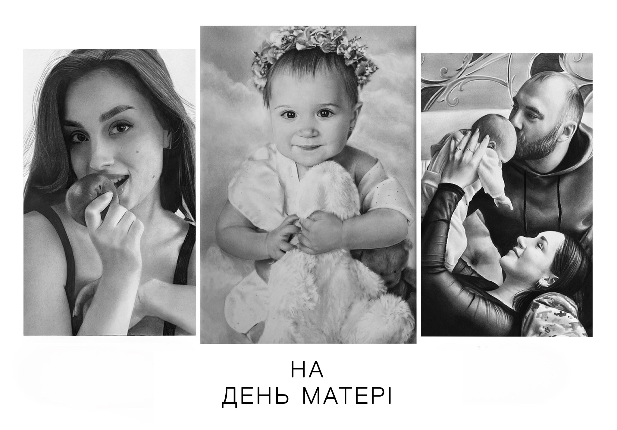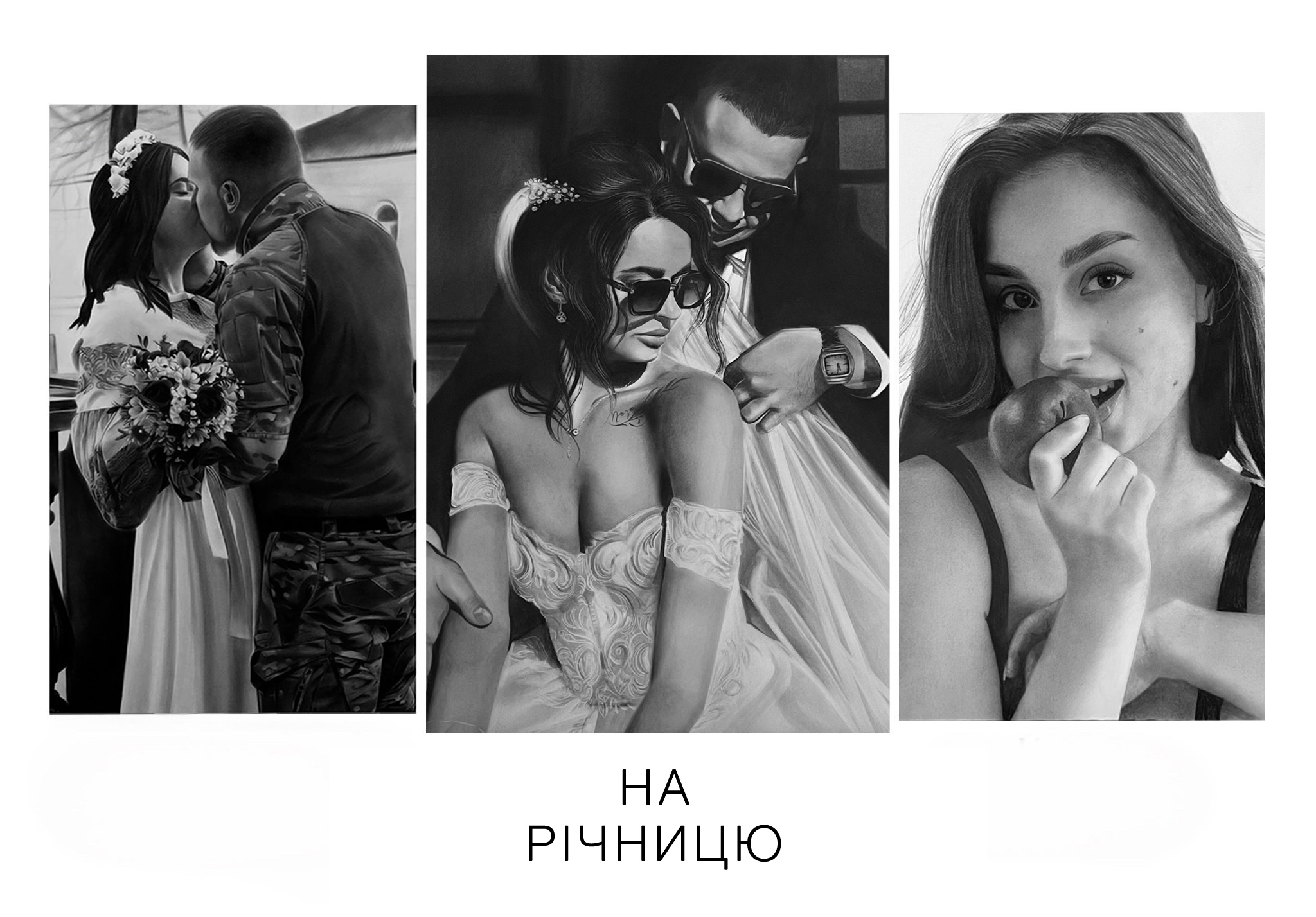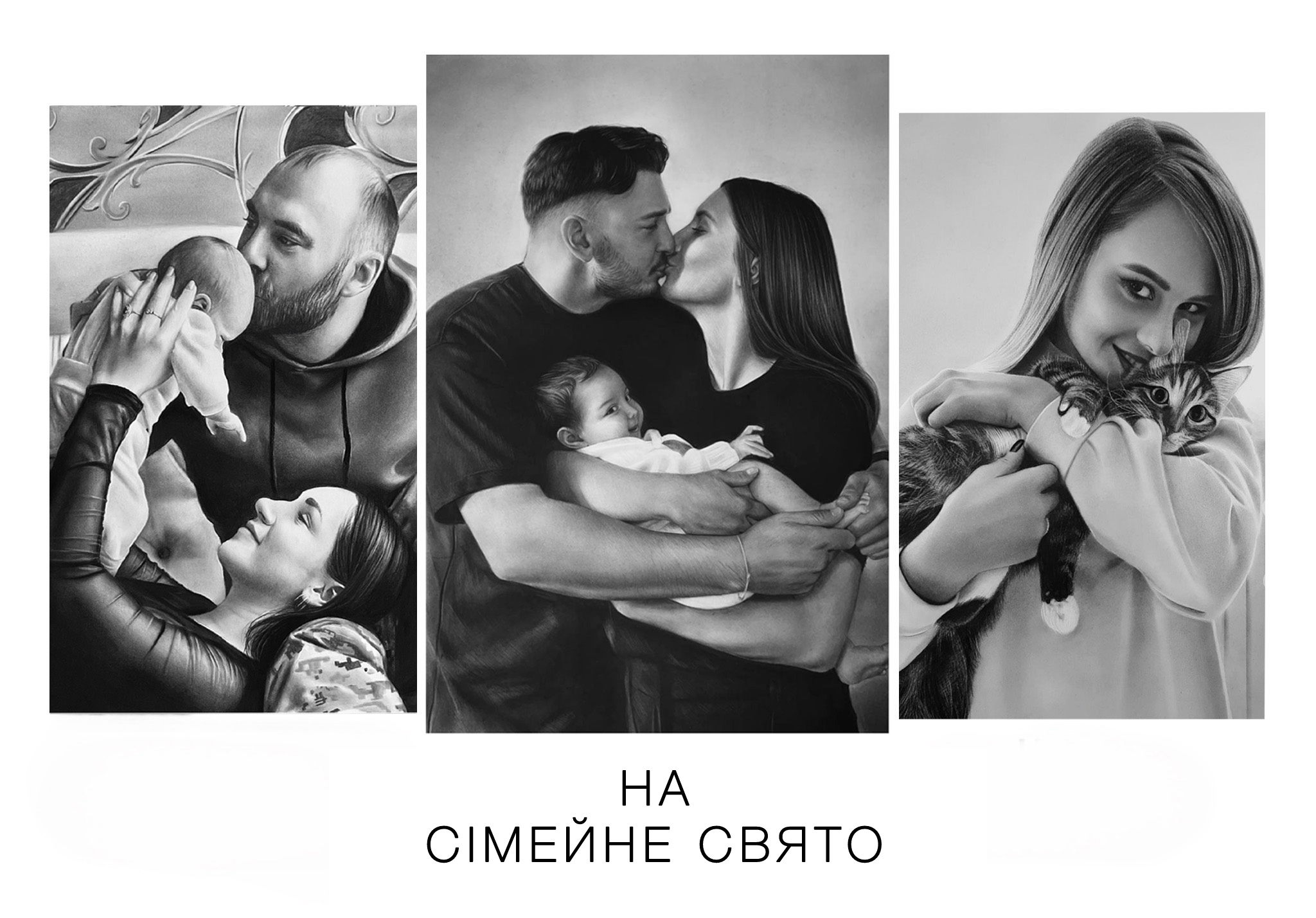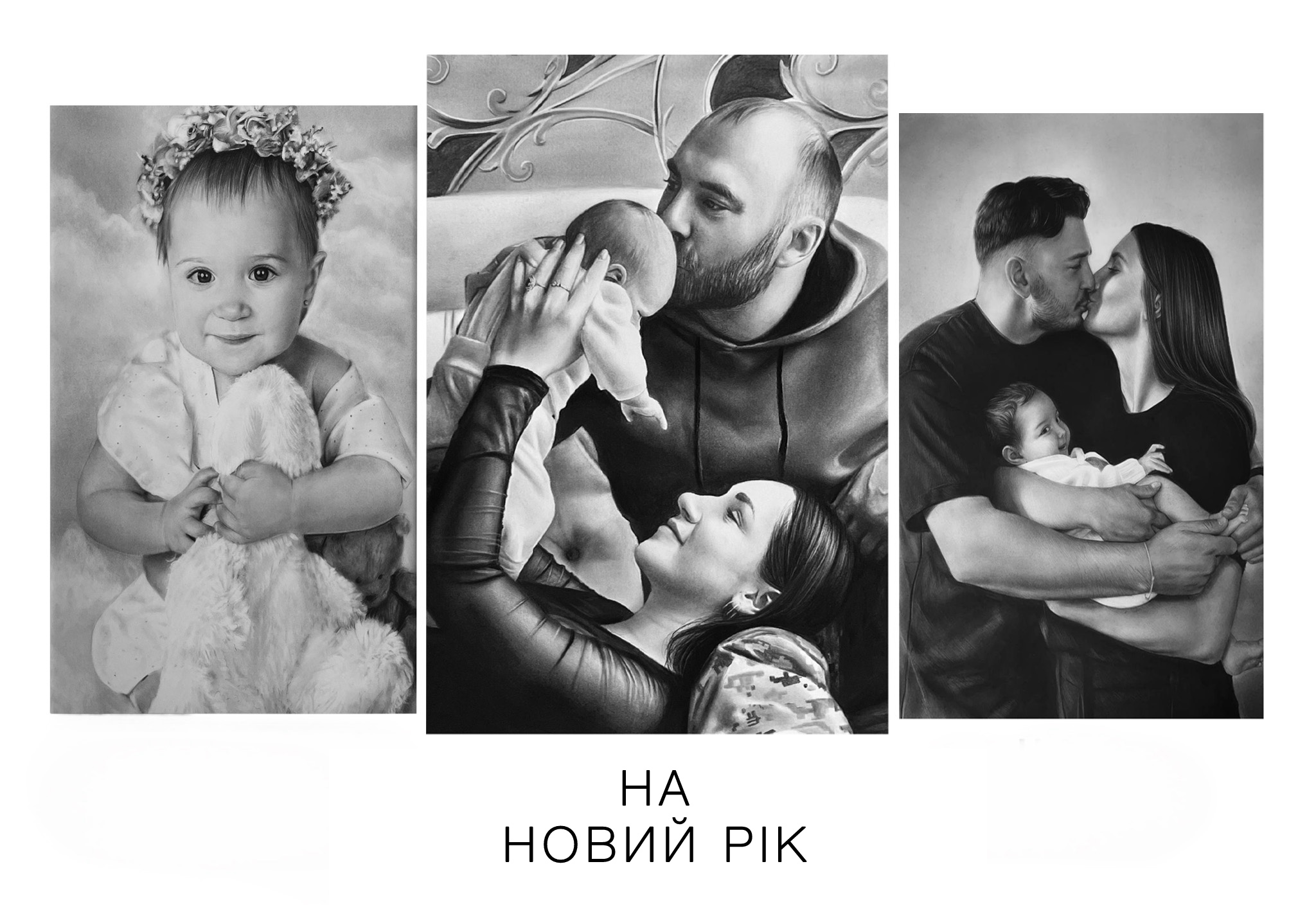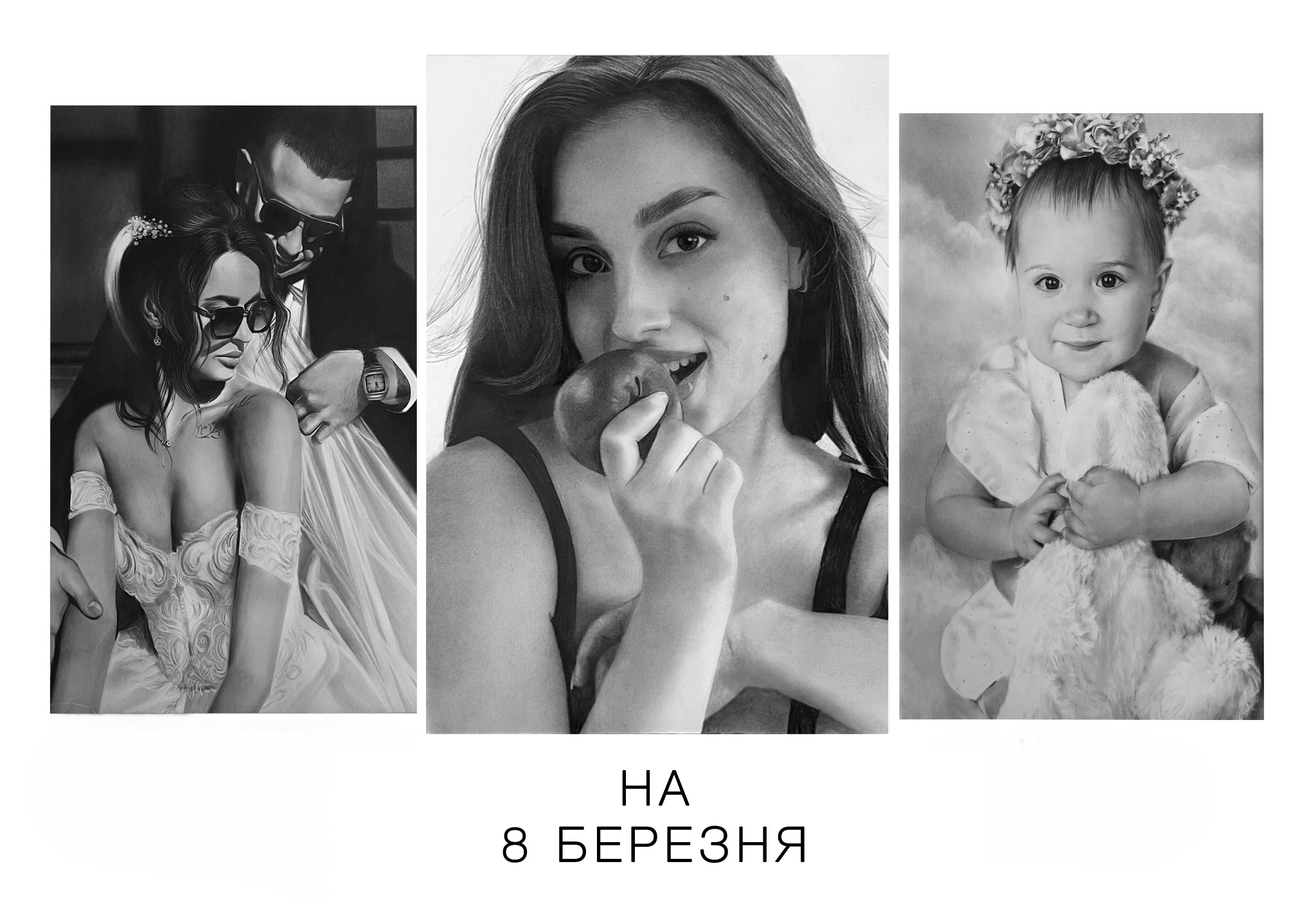 Портрети пишуться з використанням олівців, вугілля, вугільної пудри, спеціальної білої фарби та інших інструментів наших майстрів.